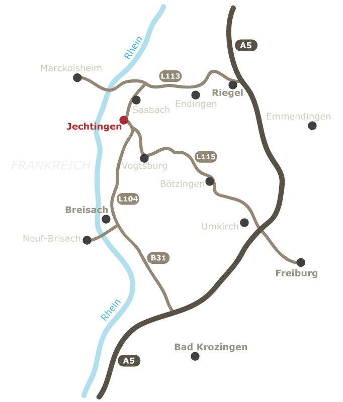 Von der A5 aus Richtung Basel kommend nehmen Sie die Ausfahrt 64a Richtung Bad Krozingen und fahren Sie direkt auf die B31 Richtung Breisach. Folgen Sie der B31 und wechseln Sie bei Breisach auf die L104 Richtung Riegel. Folgen Sie der L104 bis Jechtingen. Nachdem Sie Jechtingen verlassen haben, sind es noch etwa 100 Meter. Unser Hof befindet sich an der letzten Ausfahrt auf der linken Seite, noch bevor Sie den Bahnübergang überqueren.